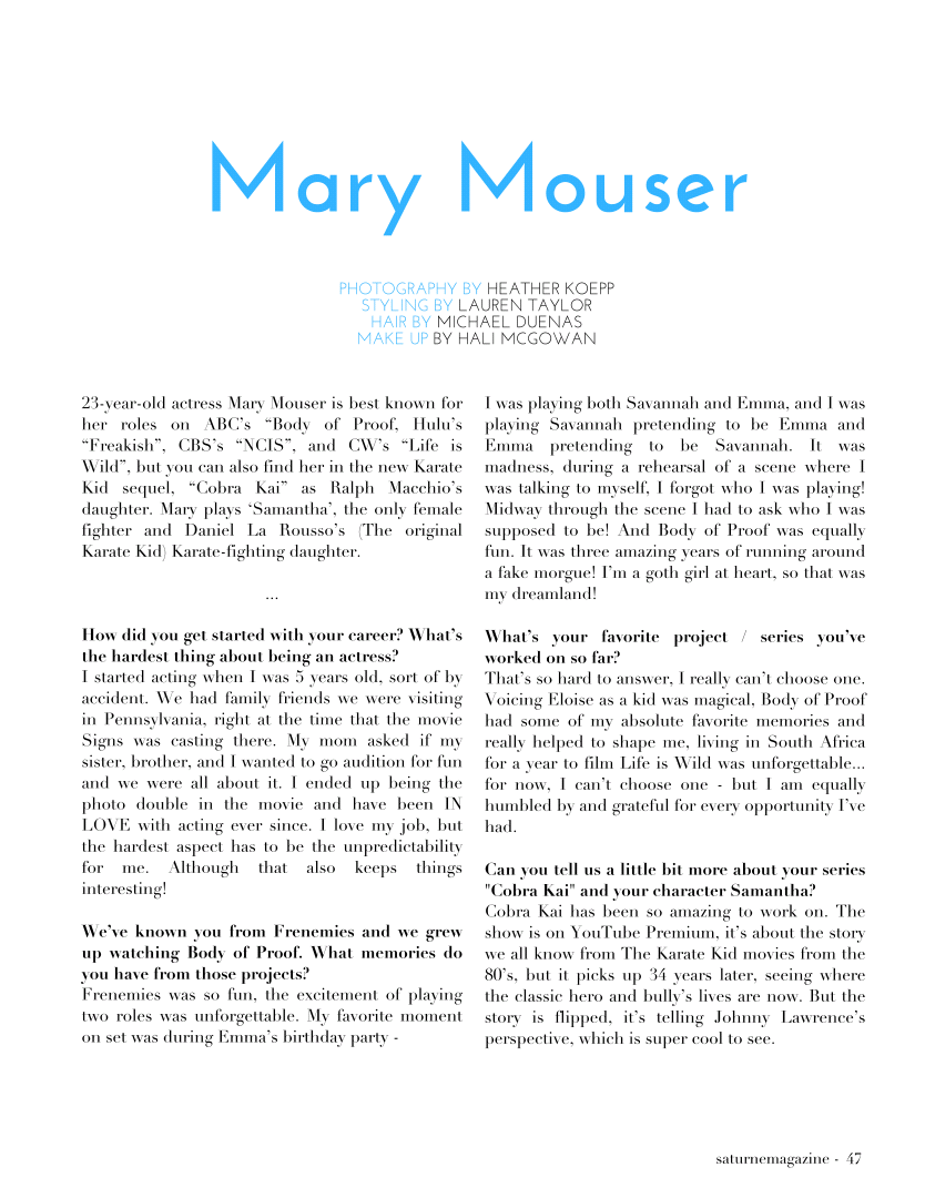 She is best known for her role as Samantha LaRusso in the Netflix series Cobra Kai and Lacey Fleming on the ABC series. Mary Mouser has Taurus zodiac sign and Earth element based on western astrology. Mary Matilyn Mouser born May 9 1996 is an American actress.